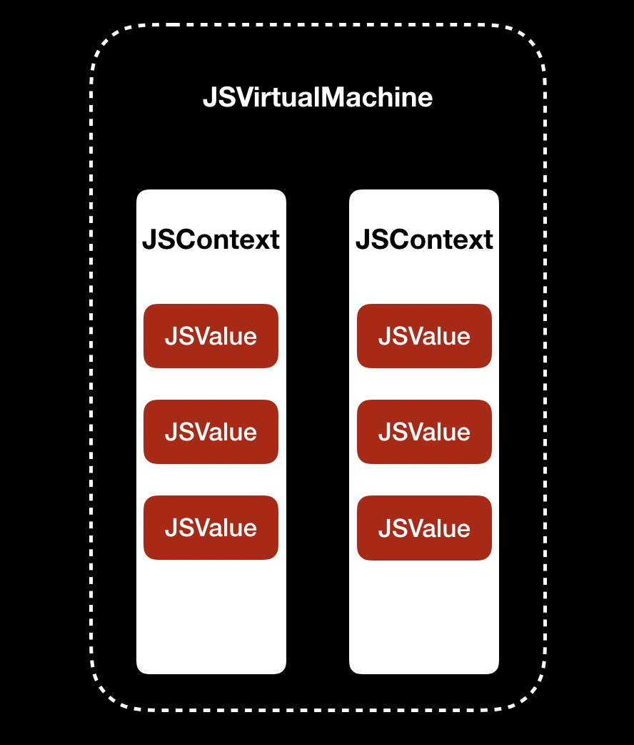 可以看出,JSVirtualMachine 里包含了多个 JSContext, 同一个JSContext 中又可以有多个 JSValue。