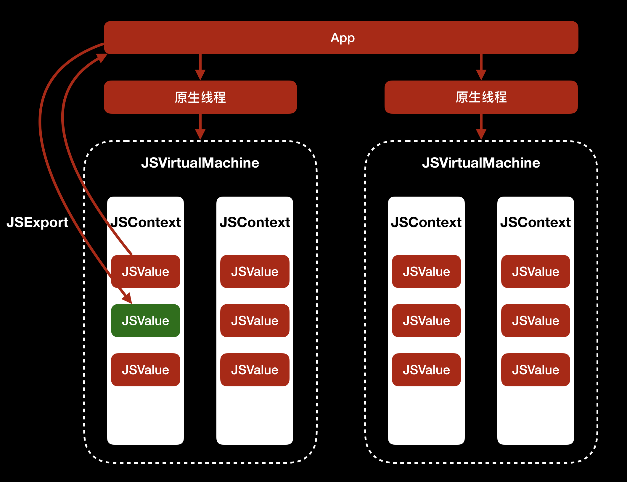 可以看到,每个 JavaScriptCore 中的 JSVirtualMachine 对应着一个原生线程,同一个 JSVirtualMachine 中可以使用 JSValue 与原生线程通信,遵循的是JSExport协议:原生线程可以将类方法和属性提供给 JavaScriptCore 使用,JavaScriptCore 可以将JSValue提供给原生线程使用。