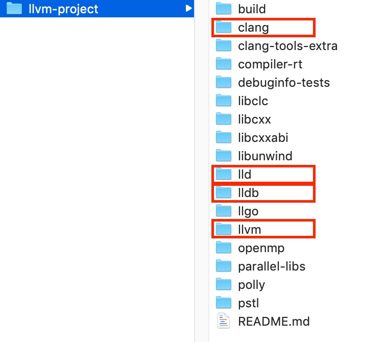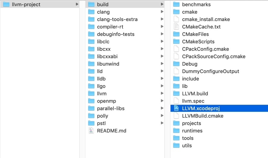其中,clang 目录就是类 C 语言编译器的代码目录;llvm 目录的代码包含两部分,一部分是对源码进行平台无关优化的优化器代码,另一部分是生成平台相关汇编代码的生成器代码;lldb 目录里是调试器的代码;lld 里是链接器代码。macOS 属于类UNIX平台,因此既可以生成 Makefile 文件来编译,也可以生成 Xcode 工程来编译。生成 Makefile 文件,你可以使用如下命令:生成 Xcode 工程,你可以使用这个命令:执行完后,会在 build 目录下生成 Xcode 工程,路径如下图: